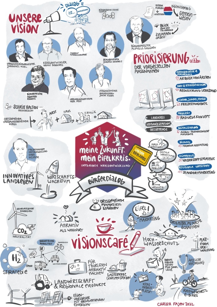 Wie sieht das Zukunftsbild für den Eifelkreis aus Sicht der Bürgerinnen und Bürger, der Unternehmen und anderer Akteure aus Politik, Verwaltung und Zivilgesellschaft aus? Was sind die wichtigsten Handlungsfelder, Maßnahmen und Projekte, die in den nächsten Jahren angepackt werden sollten?