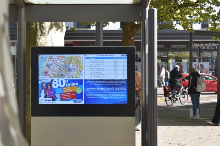 Fahrgäste können sich künftig an 38 Bushaltestellen im Verkehrsverbund Region Trier (VRT) an großen digitalen Außenmonitoren über den öffentlichen Nahverkehr informieren. Zudem werden rund 200 VRT-Busse mit moderner Fahrgastzähl-Technik ausgestattet.
