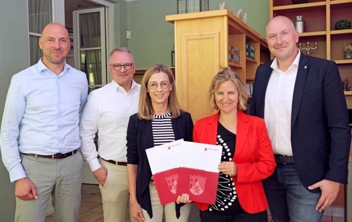 Innenstaatssekretärin Simone Schneider hat dem Bürgermeister der Ortsgemeinde Lünebach (Verbandsgemeinde Arzfeld), Albert Tautges, einen Förderbescheid in Höhe von 128.000 Euro überreicht. Gefördert wird die Wiederherstellung des Sportplatzgebäudes aus dem Sondervermögen „Aufbauhilfe 2021“.