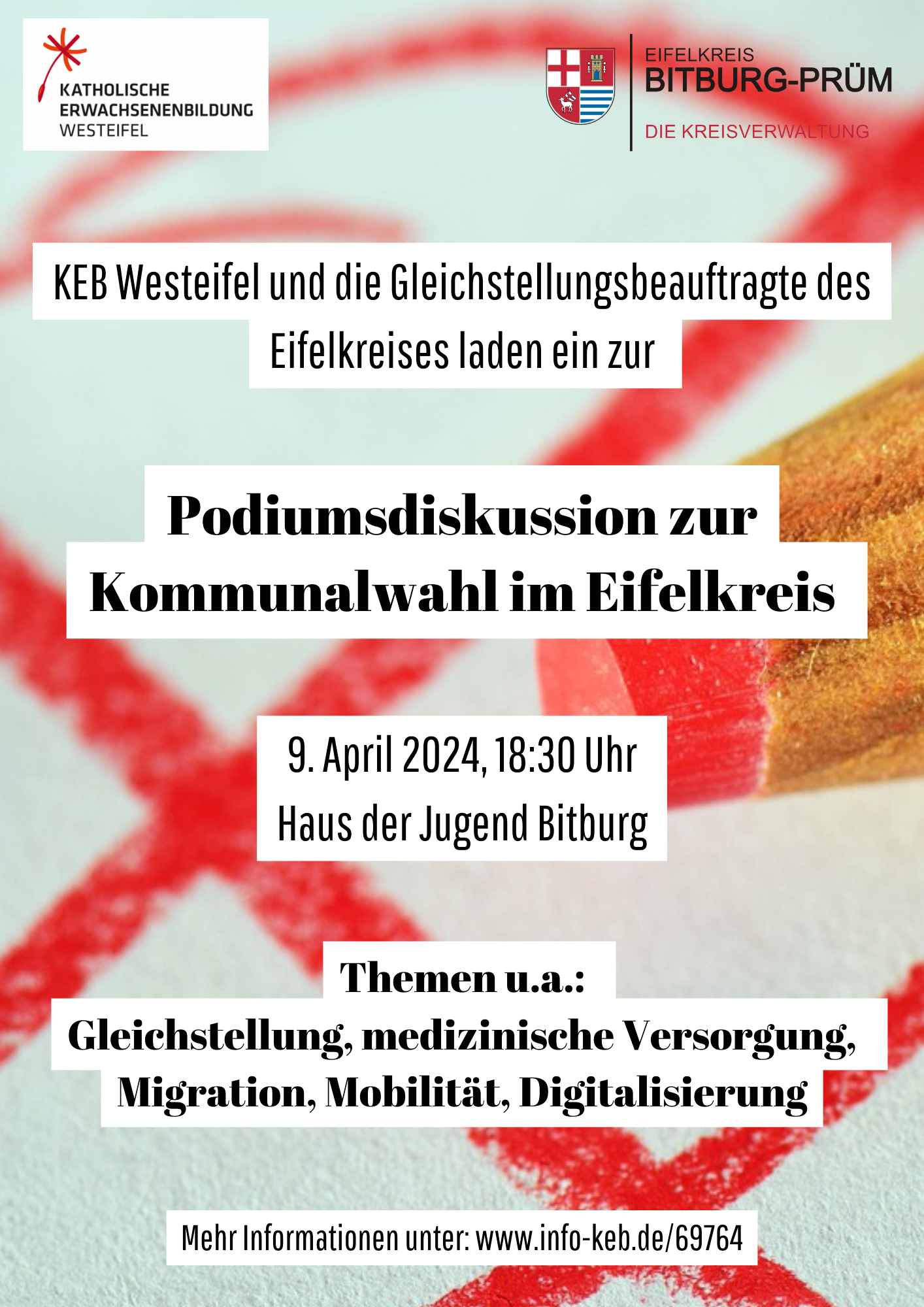 Die Katholische Erwachsenenbildung Westeifel (KEB) und die Gleichstellungsbeauftragte des Eifelkreises, Christina Hartmer, laden zu einer Podiumsdiskussion mit aktiven Kommunalpolitikern des Eifelkreises ein.