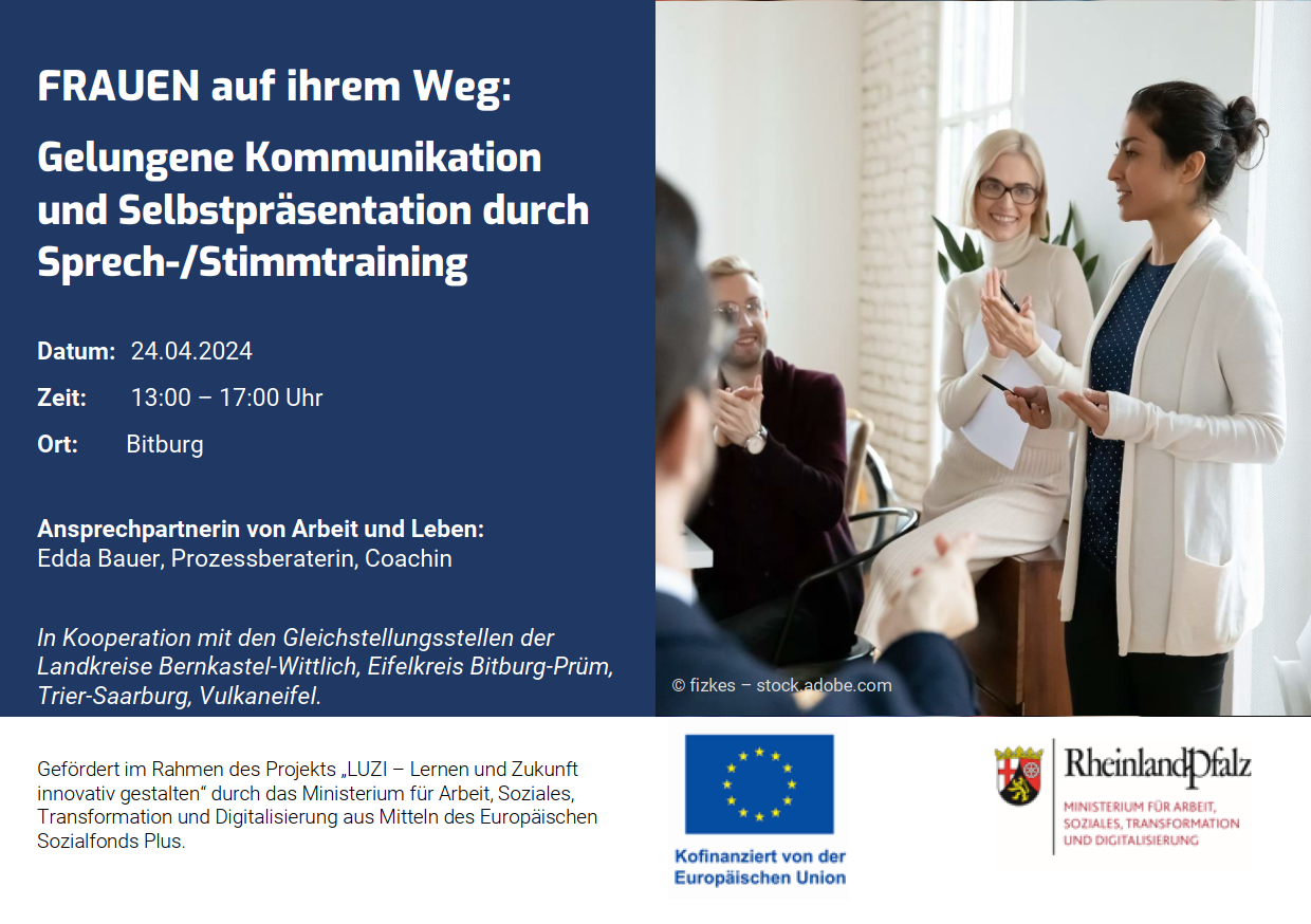 Die Gleichstellungsbeauftragten der Landkreise Eifelkreis Bitburg-Prüm, Bernkastel -Wittlich, Trier-Saarburg und Vulkaneifel bieten im Rahmen der Veranstaltungsreihe „Frauen auf ihrem Weg“ ein Seminar „Gelungene Kommunikation und Selbstpräsentation durch Sprech-/Stimmtraining“ in Bitburg an.