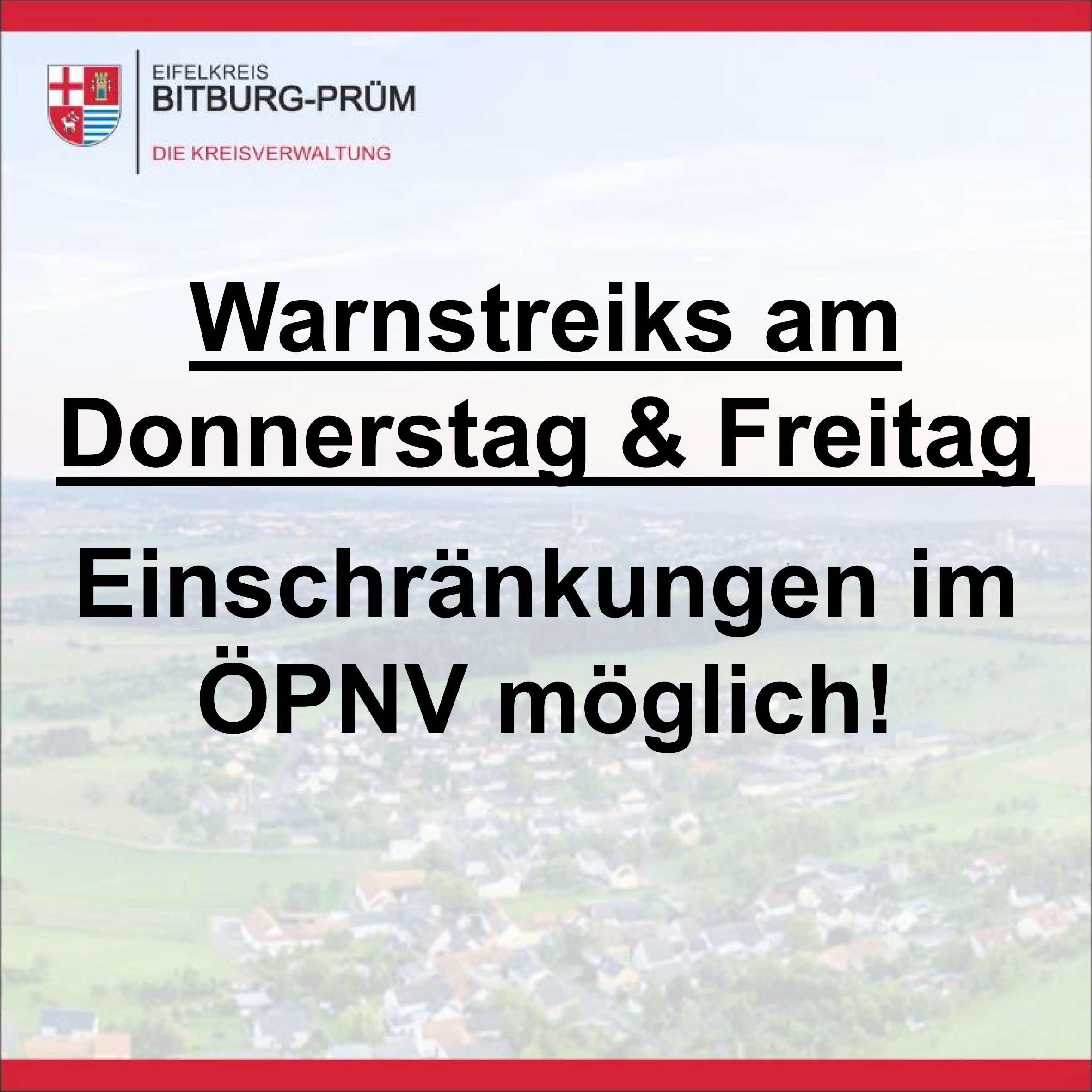 Die Gewerkschaft ver.di ruft erneut bundesweit zu Warnstreiks im ÖPNV auf. Am Donnerstag, den 29.02.2024 sowie am Freitag, den 01.03.2024 werden voraussichtlich auch Unternehmen im Eifelkreis davon betroffen sein.