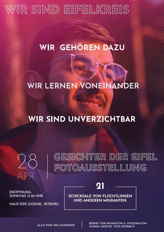 Der Beirat für Migration und Integration lädt alle Mitbürgerinnen und Mitbürger ins Bitburger Haus der Jugend zur Ausstellungseröffnung "Gesichter der Eifel – Schicksale von Flüchtlingen und anderen Migranten" ein.