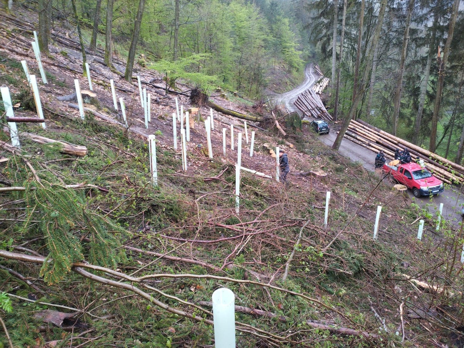 Bei einer Pflanzaktion am 16. April im Kreiswald bei Neuerburg hat die Klasse 10 b der Grund- und Realschule plus Neuerburg rund 150 neue, klimaresiliente Bäume gepflanzt.