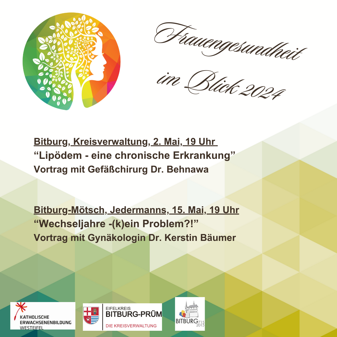 Die Katholische Erwachsenenbildung Westeifel und die Gleichstellungsbeauftragten des Eifelkreises Bitburg-Prüm und der Stadt Bitburg laden ein zu folgenden Veranstaltungen der Vortragsreihe „Frauengesundheit im Blick 2024“ ein: