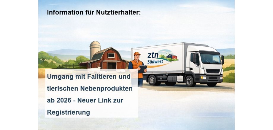 Der den Tierhaltern im Schreiben vom November 2025 vom ztn Neckar-Franken/ztn Südwest zur Verfügung gestellte Link funktioniert leider nicht. Alternativ kann die telefonische Anmeldung von benötigten Entsorgungen unter 06283 / 22120 erfolgen.
