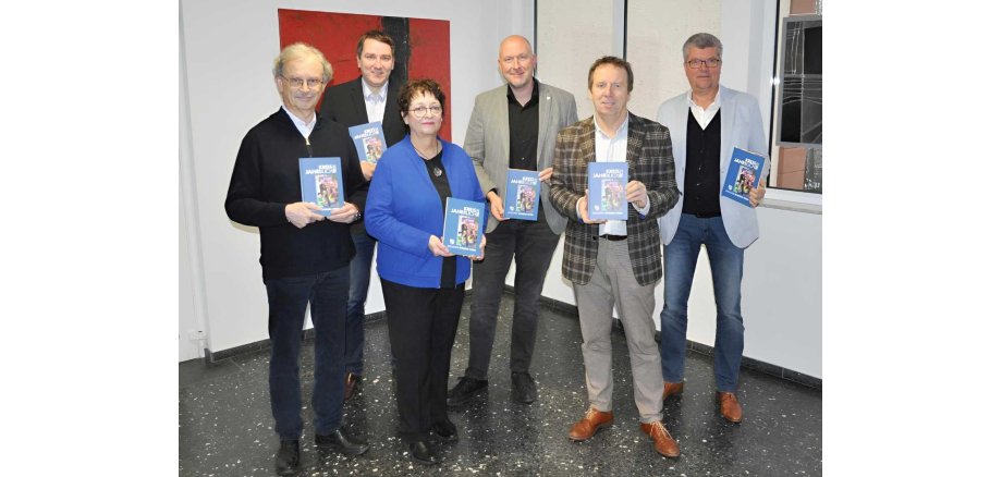 Von links: Die Mitglieder im Redaktionsausschuss Rudolf Müller, Georg von Schichau und Brigitte Kreutz, Landrat Andreas Kruppert, Museumsleiter Burkhard Kaufmann und Kulturamtsleiter Herbert Fandel (Foto: Kreisverwaltung)