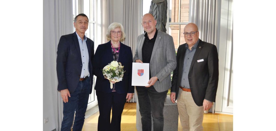 Der Geschäftsführer des Jobcenters Bitburg-Prüm, Markus Regnery, Landrat Andreas Kruppert und Büroleiter Carl Diederich verabschieden Elisabeth Schmidt in den Ruhestand. (v.l.) Foto: Kreisverwaltung