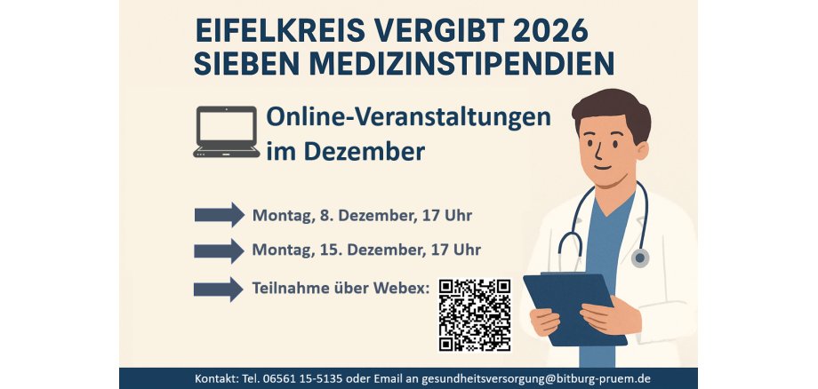 Kontakt: Tel. 06561 15-5135, Email: gesundheitsversorgung@bitburg-pruem.de. Mehr unter: https://www.bitburg-pruem.de/aktuell/pressemitteilungen/2025/oktober/eifelkreis-vergibt-2026-sieben-medizinstipendien/