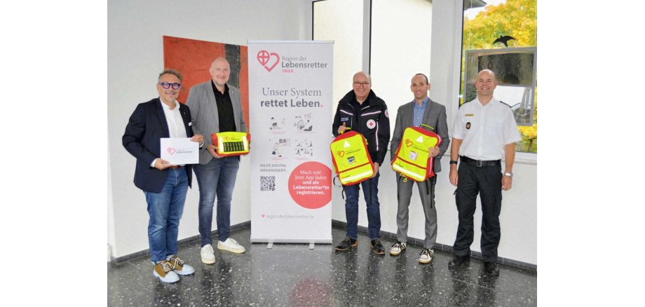 Gemeinsamer Start für die Ersthelfer-App im Eifelkreis (von rechts): Dr. Andreas Palzer (stellv. Chef der Trierer Berufsfeuerwehr), Dr. Dirk Nauheimer (Oberarzt Klinikum Brüderkrankenhaus Trier), Rainer Hoffmann (Kreisgeschäftsführer DRK Bitburg-Prüm), Landrat Andreas Kruppert, der Erste Kreisbeigeordnete Michael Ludwig, MdL (Foto: Kreisverwaltung)