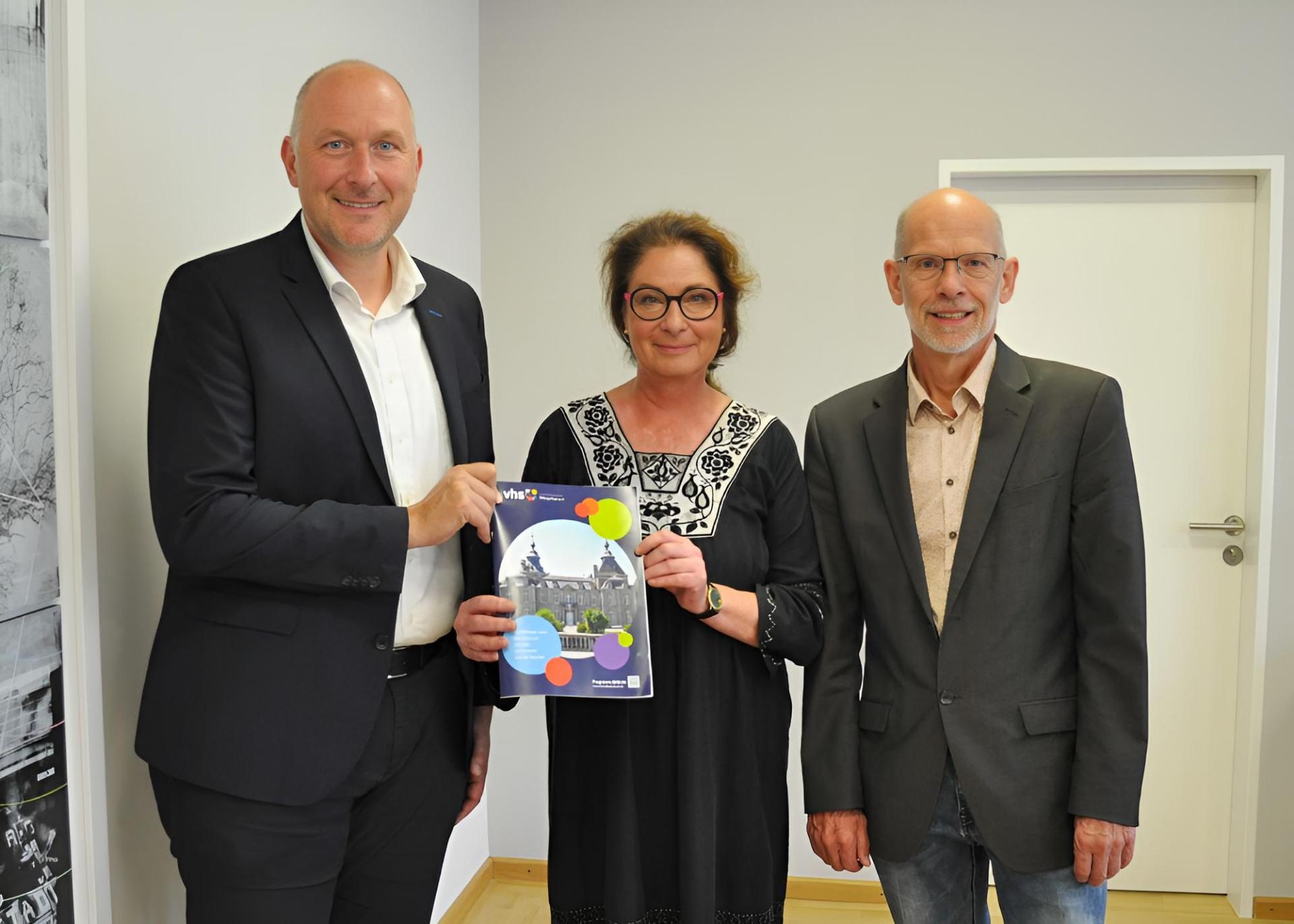 Am 1. September 2025 übergab die ehrenamtliche pädagogische Leiterin der Volkshochschule des Eifelkreises, Dr. Barbara Mikuda-Hüttel, dem Vorsitzenden der Kreisvolkshochschule, Landrat Andreas Kruppert, das druckfrische Programmheft 2025/26.