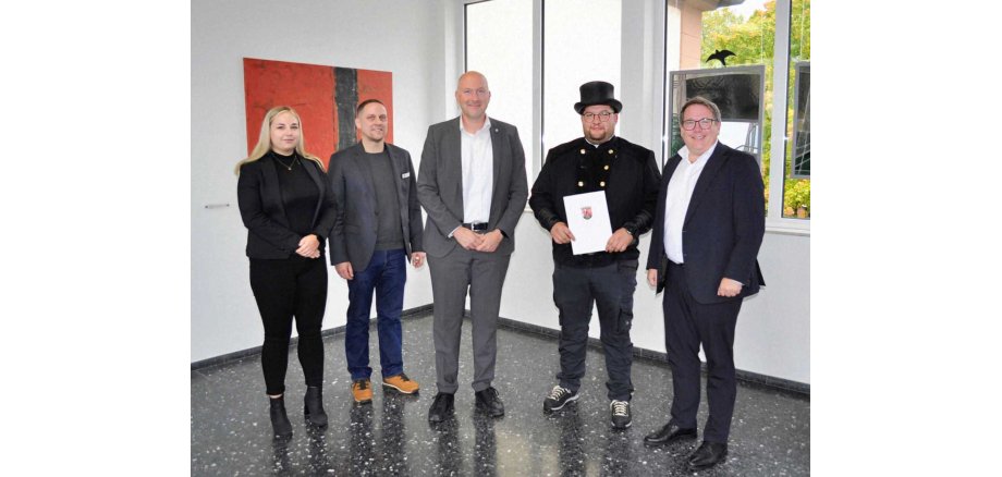 Von links: Sachbearbeiterin Marie Greiner, Amtsleiter Nils Leinen, Landrat Andreas Kruppert, Bezirksschornsteinfeger Jan Köhler und ADD-Präsident Thomas Linnertz (Foto: Kreisverwaltung)