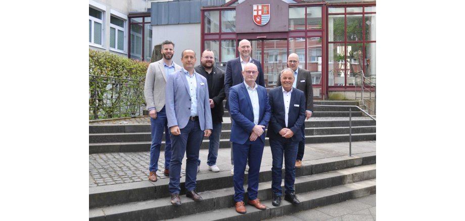 Die Dienstjubilare Reiner Eppers und Günter Gansen (vorne v. l.) im Kreise ihrer Gratulanten: Andreas Heiseler, Landrat Andreas Kruppert, Carl Diederich (2. Reihe v. l.), Markus Sohns und Mario Schuh (hinten v. l.). Foto: Kreisverwaltung