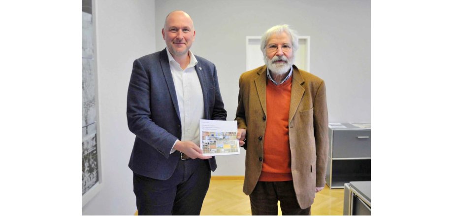 Dr. Richard Hüttel überreicht das erste Buchexemplar an Landrat Andreas Kruppert (Foto: Kreisverwaltung)