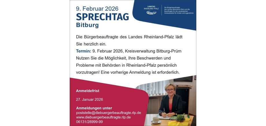 Nutzen Sie die Möglichkeit, Ihre Beschwerden und Probleme mit Behörden in Rheinland-Pfalz persönlich vorzutragen. Anmeldungen unter poststelle@diebuergerbeauftragte.rlp.de oder Tel. 06131 28999-99.